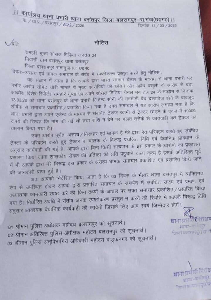 इसी संदर्भ में बसंतपुर थाना प्रभारी द्वारा पत्रकार रामहरी गुप्ता को नोटिस जारी किया गया है। नोटिस में कहा गया है कि भारत सम्मान चैनल और सोशल मीडिया प्लेटफॉर्म पर प्रसारित समाचार को असत्य और भ्रामक बताया गया है तथा इससे शासकीय सेवक की प्रतिष्ठा प्रभावित होने की बात कही गई है। साथ ही तीन दिनों के भीतर थाना बसंतपुर में उपस्थित होकर स्पष्टीकरण देने को कहा गया है, अन्यथा वैधानिक कार्रवाई की चेतावनी दी गई है।