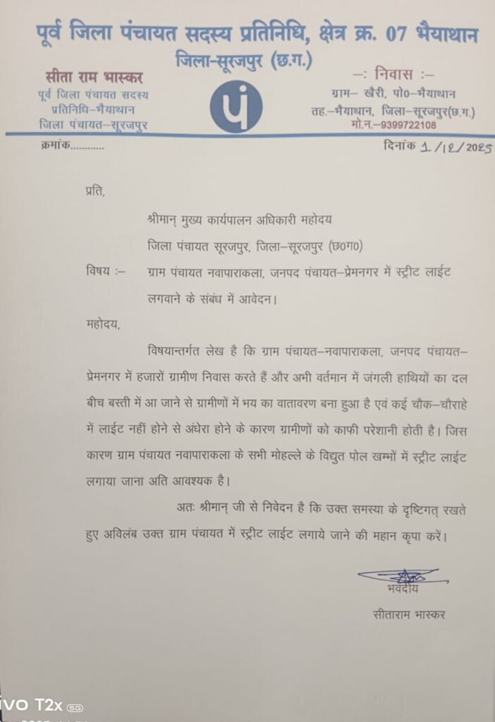 सूरजपुर। जनपद पंचायत प्रेमनगर के अंतर्गत आने वाले ग्राम पंचायत नवापाराकला में पिछले कई दिनों से जंगली हाथियों के गांव में प्रवेश की घटनाएँ बढ़ गई हैं। रिहायशी क्षेत्रों में हाथियों की दस्तक से ग्रामीण लगातार भयभीत हैं। अंधेरा होते ही पूरा गांव दहशत के माहौल में जीने को मजबूर है। सुरक्षा के इस अहम मुद्दे को लेकर पूर्व जिला पंचायत सदस्य सीताराम भास्कर ने सोमवार को जिला पंचायत सूरजपुर के मुख्य कार्यपालन अधिकारी श्री पाटले को ज्ञापन सौंपकर गांव में तत्काल स्ट्रीट लाइट लगाने की मांग की।