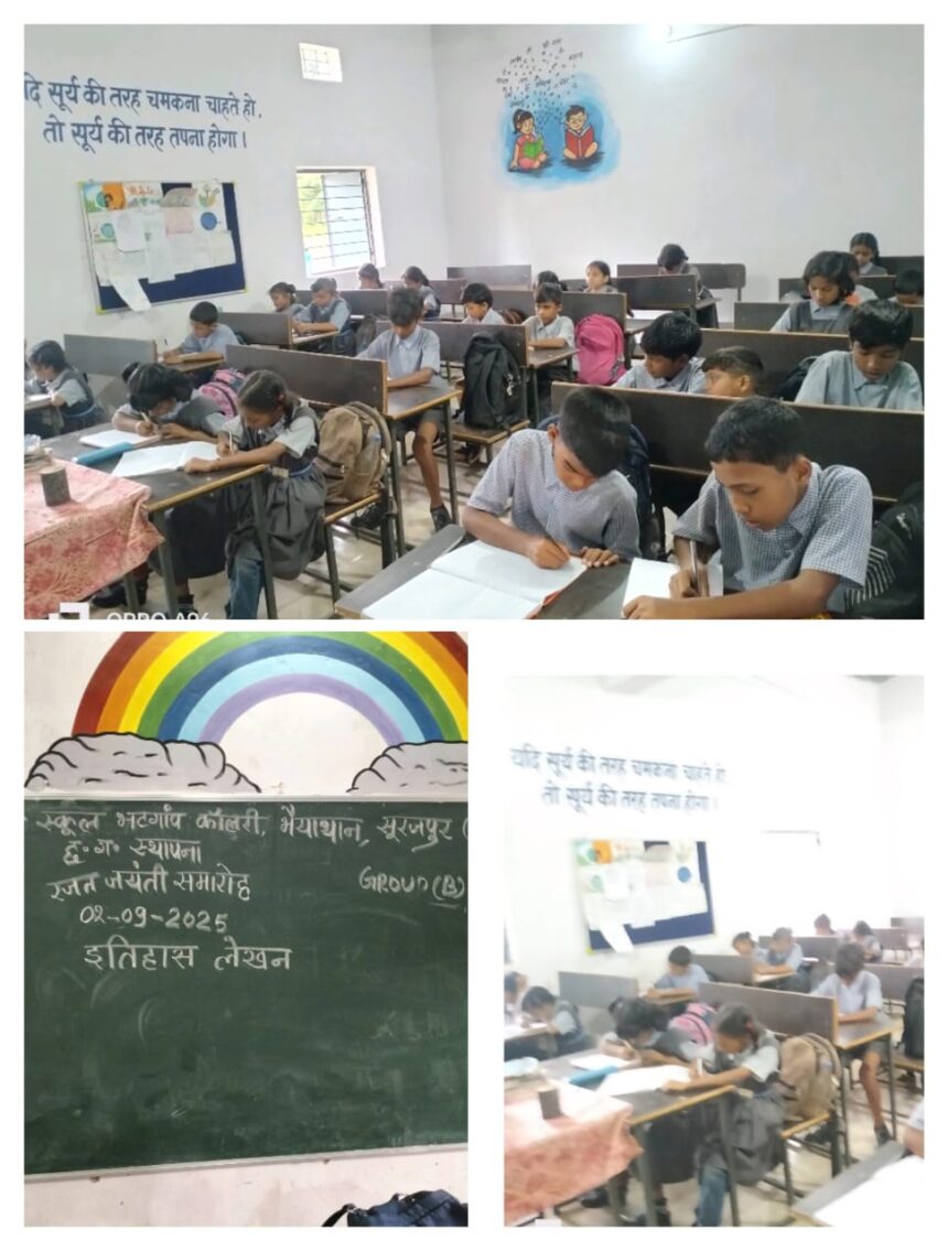 सूरजपुर/02 सितंबर 2025 राज्य परियोजना कार्यालय समग्र शिक्षा रायपुर के आदेशानुसार तथा कलेक्टर श्री एस. जयवर्धन एवं मुख्य कार्यपालन अधिकारी, जिला पंचायत श्री विजेन्द्र सिंह पाटले के निर्देशन में तथा जिला शिक्षा अधिकारी अजय कुमार मिश्रा (नोडल अधिकारी) एवं जिला मिशन समन्वयक शशिकान्त सिंह (सहा.नोडल अधिकारी) के मार्गदर्शन में छत्तीसगढ़ राज्य की स्थापना की 25 वर्ष पूर्ण होने के अवसर पर सभी विभागों द्वारा रजत जयंती वर्ष 2025 का आयोजन किया जा रहा है, जिसके तहत् स्कूल शिक्षा विभाग सूरजपुर जिले के सभी शासकीय विद्यालयों में कार्यक्रम का आयोजन किया जा रहा है। इतिहास लेखन का संबंध उनकी रचनात्मकता, आलोचनात्मक सोच और अतीत की घटनाओं को अपने दृष्टिकोण से समझने की क्षमता से है, इतिहास को सिर्फ तथ्यों के संग्रह के रूप में देखने के बजाय, जीवित और गतिशील विषय के रूप में समझने में मदद करती है। बच्चों के द्वारा इतिहास लेखन में रूचि के अनुसार परिवार का इतिहास, उनके स्कूल का इतिहास, तथा अपने परिजनों से सुनी हुई कहानियों को लिखना तथा उसका वाचन करना ही इतिहास लेखन का उद्देश्य है।