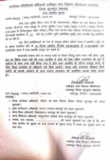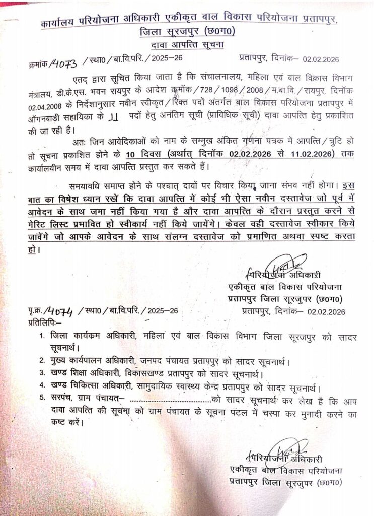 सूत्रों के अनुसार मामला सूरजपुर जिला में महिला एवं बाल विकास विभाग की सहायिका भर्ती से जुड़ा बताया जा रहा है। खासतौर पर प्रतापपुर ब्लॉक के ग्राम पंचायत बोझा में निकली पोस्ट को लेकर आरोप लगे हैं कि फर्जी दस्तावेज तैयार कर निजी व्यक्ति को लाभ पहुंचाने की कोशिश की गई।