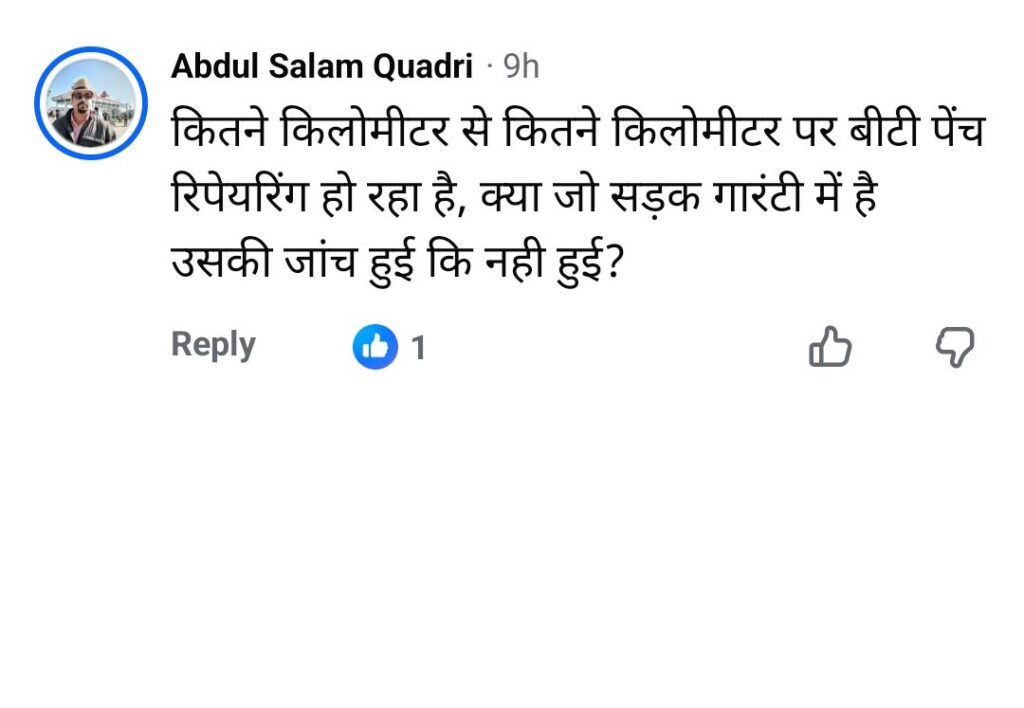 “कितने किलोमीटर से कितने किलोमीटर पर बीटी पैच रिपेयरिंग हो रहा है, और क्या जो सड़क गारंटी में है, उसकी जांच हुई या नहीं हुई?”