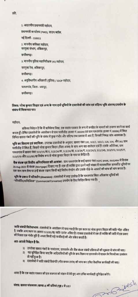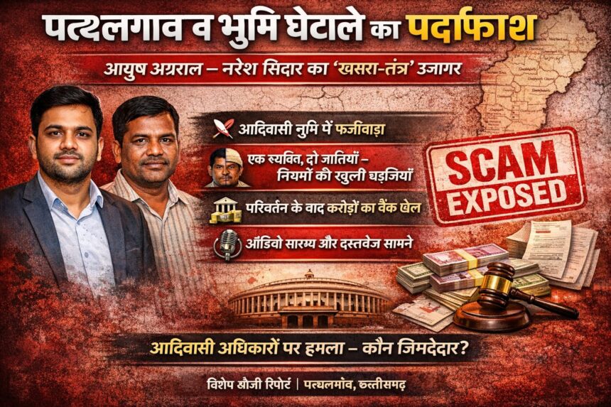 पत्थलगांव:–जिले में आदिवासी जमीनों को हड़पने और उनके दस्तावेजों के साथ ‘जादूगरी’ करने का एक ऐसा सनसनीखेज मामला सामने आया है, जिसने सत्ता के गलियारों में हड़कंप मचा दिया है। स्वतंत्र पत्रकार ऋषिकेश मिश्रा की शिकायत और एक एक्सक्लूसिव ऑडियो क्लिप ने आयुष अग्रवाल और नरेश कुमार सिदार के उस गठजोड़ की पोल खोल दी है, जो शासन के कड़े नियमों को ठेंगा दिखाकर जमीनों का स्वरूप बदल रहे हैं।