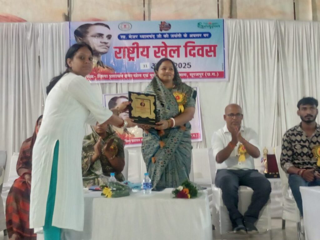 सूरजपुर 01 सितंबर 2025  जिला प्रशासन तथा खेल एवं युवा कल्याण विभाग द्वारा खेल दिवस का आयोजन 29 अगस्त से 31 अगस्त तक सफलतापूर्वक संचालित किया गया। जिसका समापन समारोह विगत दिवस 31 अगस्त को मंगल भवन सूरजपुर में किया गया। जिसका मुख्य अतिथि जिला पंचायत अध्यक्ष श्रीमती चंद्रमणी सिंह पैकरा, जनपद अध्यक्ष श्रीमती श्वाती संत सिंह, श्रीमती चंद्रावती, श्रीमती सोनिया, श्रीमती रामकुमारी तथा बंटी ठाकुर कार्यक्रम में उपस्थित रहे। सभी विजेता खिलाड़ियों को पुरस्कृत किया गया। बालिका वर्ग के बॉलीवॉल खेल मे प्रथम पुरस्कार बरपारा, द्वितीय पुरस्कार भटगांव, बालक वर्ग मे प्रथम गजाधरपुर, बेस्ट लिफटर नैना देवागंन, बेस्ट डिफेडर संध्या सिंह, पुरूष वर्ग में बेस्ट अटेकर सौरभ, बेस्ट डिफेंडर प्रिंस, बेस्ट लिकटर राजेन्द्र राजवाड़े थे।