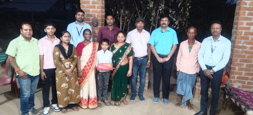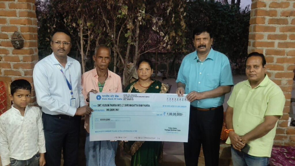 डीआईजी व एसएसपी सूरजपुर श्री प्रशांत कुमार ठाकुर व एसबीआई रिजनल मैनेजर अविनाश पाणिग्रही ने दिवंगत आरक्षक के गृहग्राम चकेरी पहुंच सौपा 1 करोड़ का चेक।