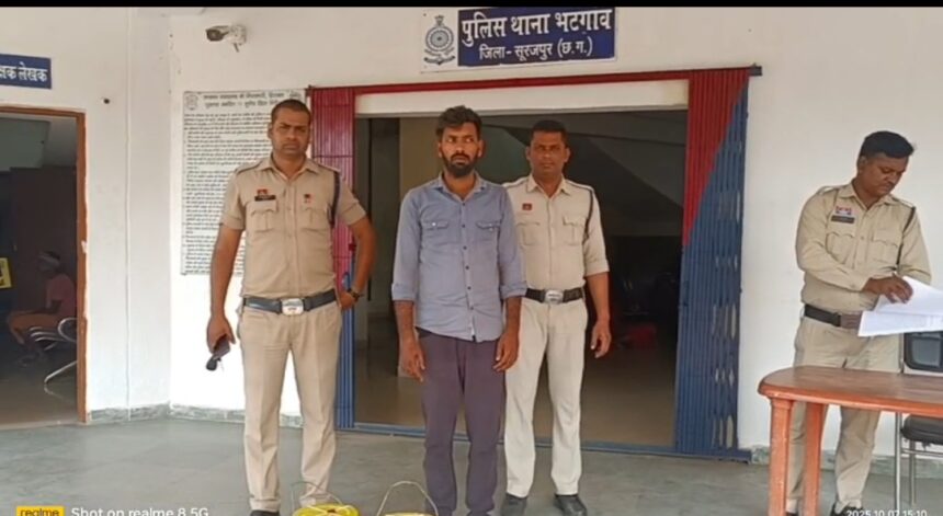 सूरजपुर:–डीआईजी व एसएसपी श्री प्रशांत कुमार ठाकुर के सख्त निर्देश पर थाना-चौकी की पुलिस के द्वारा लगातार अवैध कारोबार, सूखा नशा एवं मादक पदार्थ के विरूद्ध कार्यवाही की जा रही है। इसी परिप्रेक्ष्य में दिनांक 06.10.2025 को थाना भटगांव पुलिस को मुखबीर ने सूचना दिया कि अनीश गुप्ता निवासी बंशीपुर अपने घर-आंगन में मादक पदार्थ गांजा बिक्री हेतु छिपा कर रखा है।