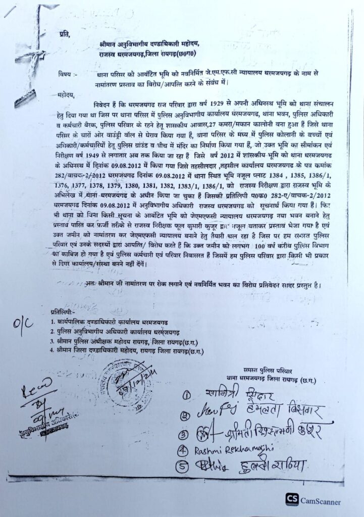 दस्तावेज़ के अनुसार, धर्मजयगढ़ थाना परिसर की भूमि को वर्ष 1929 में राज परिवार द्वारा थाना संचालन के लिए दिया गया था। इस परिसर में वर्तमान में पुलिस अनुविभागीय कार्यालय, थाना भवन, पुलिस अधिकारी-कर्मचारी बैरक और पुलिस कॉलोनी स्थित है। सरकारी रिकॉर्ड के मुताबिक, वर्ष 2012 में इस भूमि को औपचारिक रूप से नजूल प्लॉट संख्या 1384 से 1386/1 सहित विभिन्न क्रमांकों के तहत थाना धर्मजयगढ़ के अधीन दर्ज किया गया था।